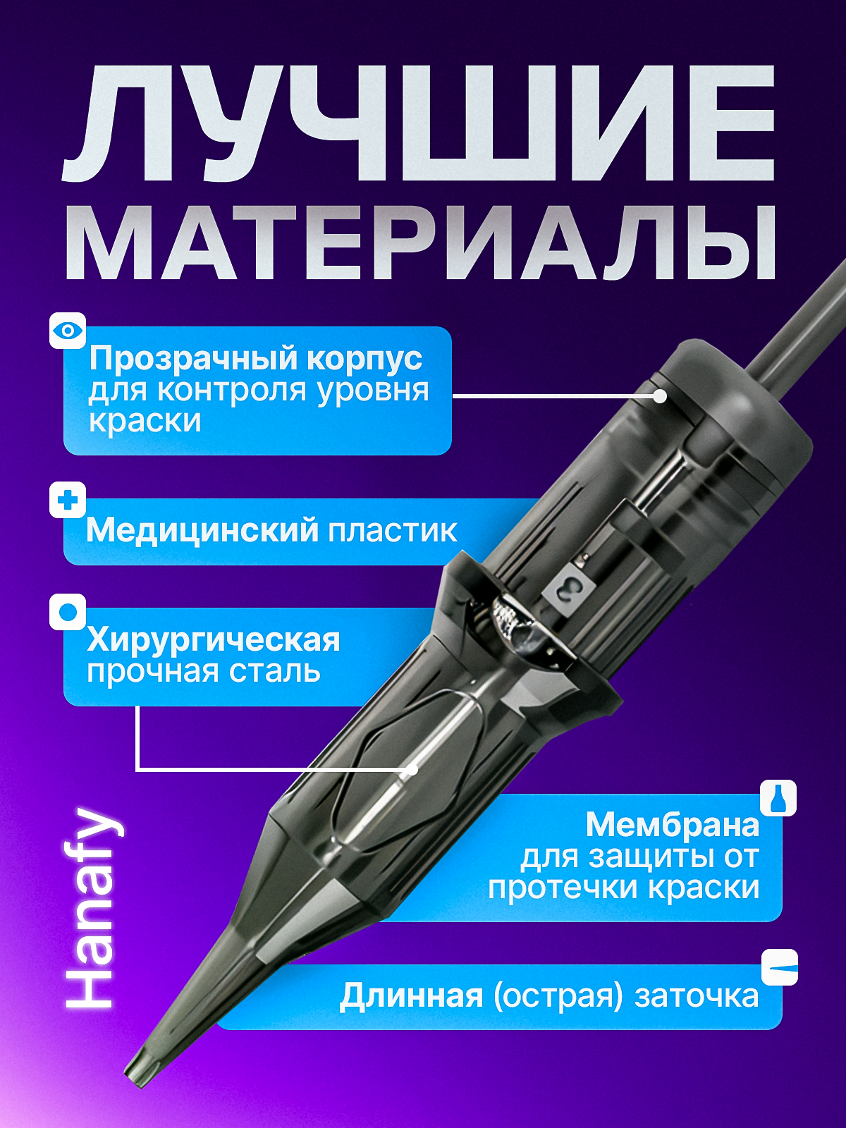 В чем его отличие от фиолетового картриджа Hanafy аналогичной маркировки? Иглы в серых картриджах Hanafy немного мягче, тупее. Такие иглы хорошо подходят для работы со сложной кожей: жирной, пористой, сосудистой, выделяющей большое количество лимфы. Они менее травматичны, позволяют быстрее и поверхностнее вносить пигменты для перманентного макияжа или татуировки. Работа с серыми картриджами от Ханафи также предполагает подгиб иглы.