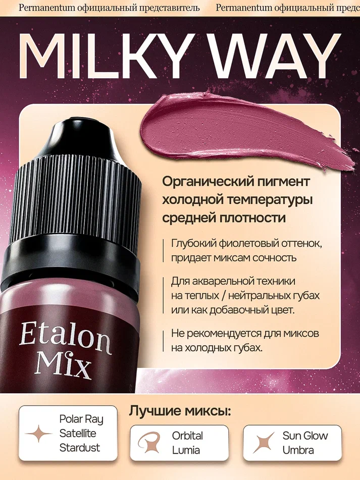 Органический пигмент холодной температуры средней плотности. Глубокий фиолетовый оттенок, который придает миксам сочность и выразительность. Может использоваться в чистом виде только в технике акварельной укладки на теплых или нейтральных губах, однако чаще применяется как добавочный цвет для получения более насыщенного фиолетового подтона. Не рекомендуется использовать в миксах на холодных пигментированных губах.